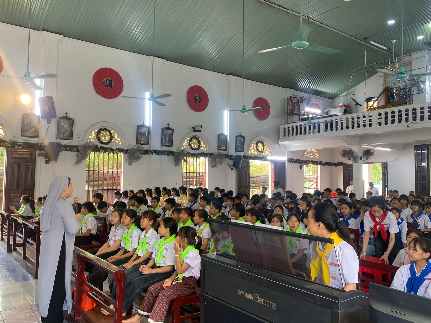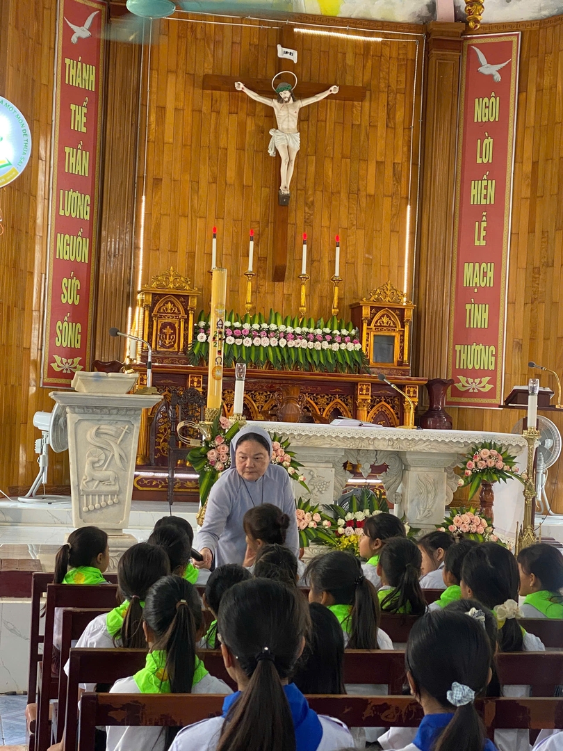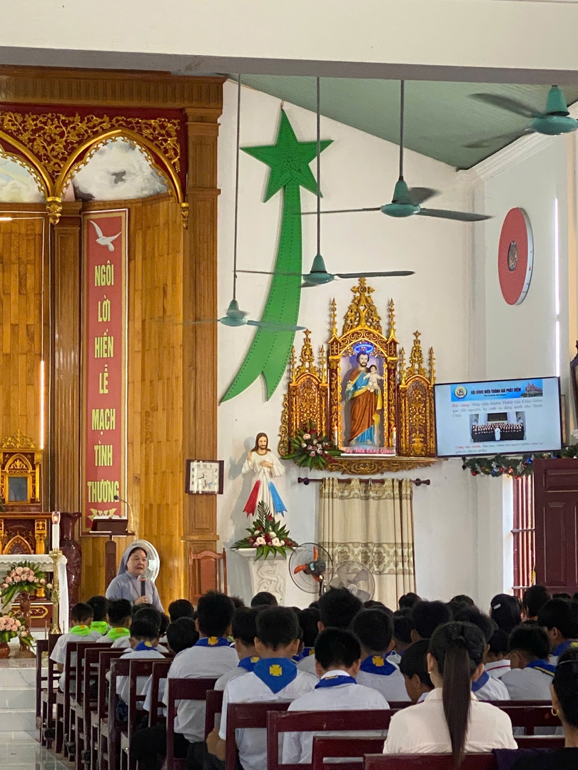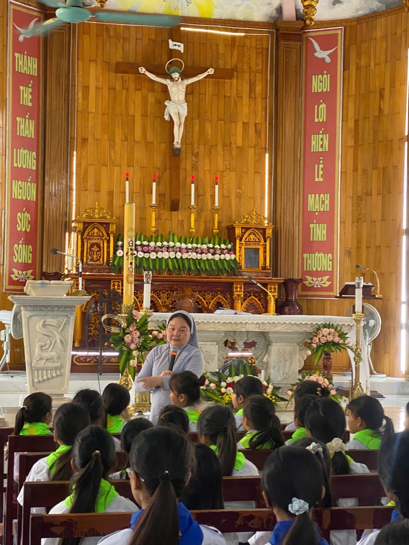 Hình ảnh các Sơ Đức Bà Truyền Giáo giới thiệu về Hội dòng và các ơn gọi trong Giáo Hội cho thiếu nhi giáo xứ Đồng Đinh, GP Phát Diệm nhân ngày lễ Chúa Chiên Lành, cầu nguyện cho ơn thiên triệu linh mục tu sĩ, 26/4/2026.