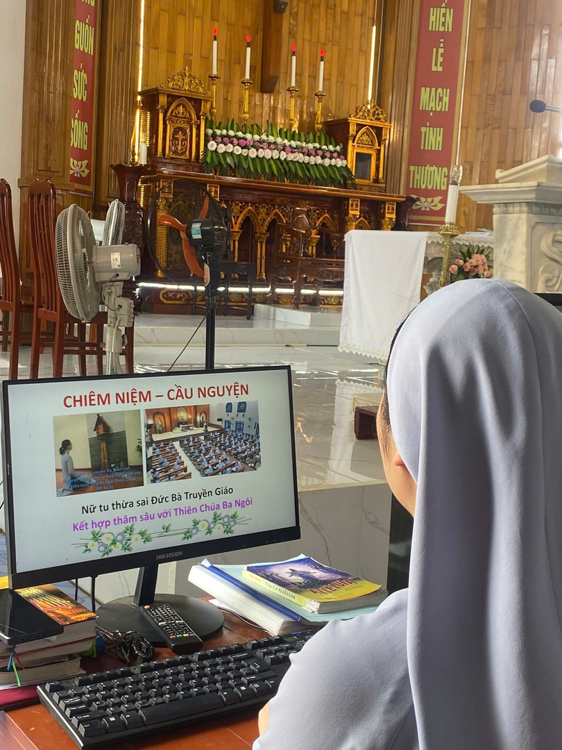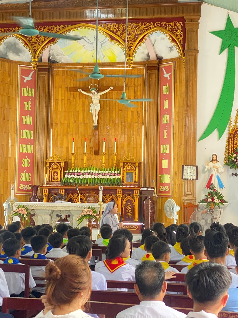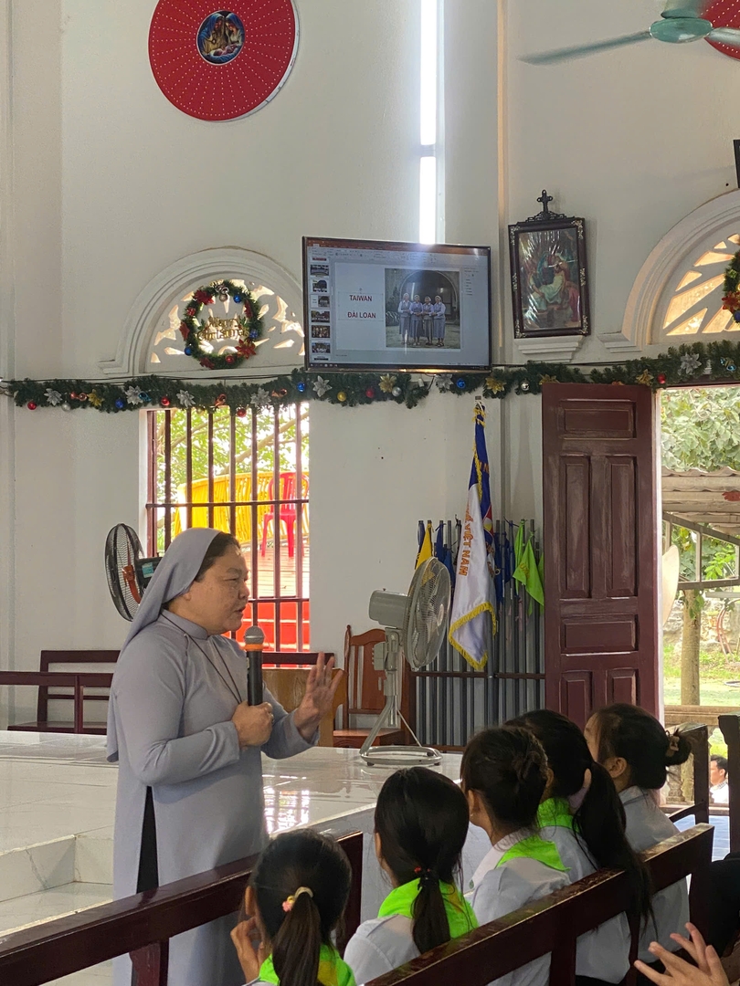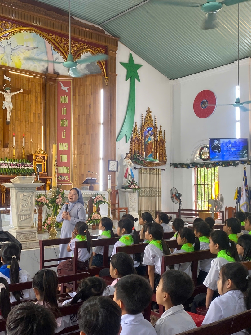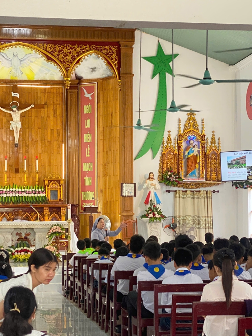 Hình ảnh các Sơ Đức Bà Truyền Giáo giới thiệu về Hội dòng và các ơn gọi trong Giáo Hội cho thiếu nhi giáo xứ Đồng Đinh, GP Phát Diệm nhân ngày lễ Chúa Chiên Lành, cầu nguyện cho ơn thiên triệu linh mục tu sĩ, 26/4/2026.