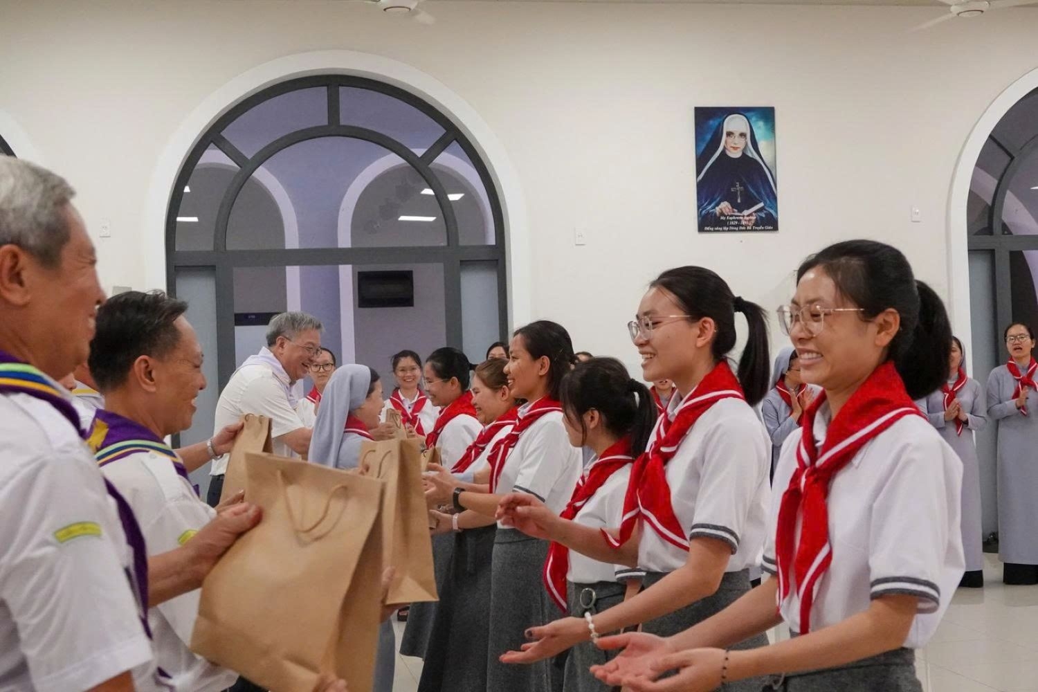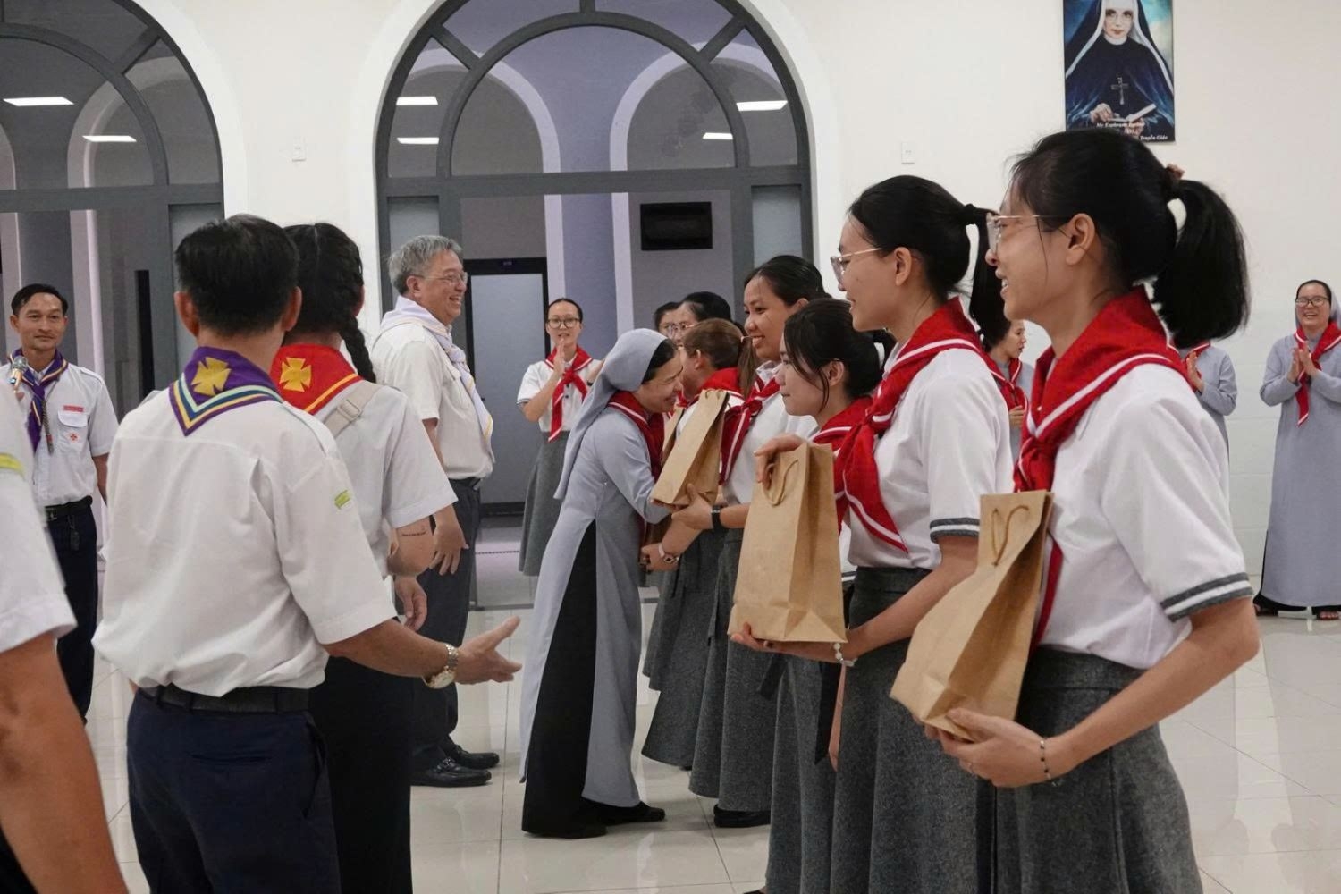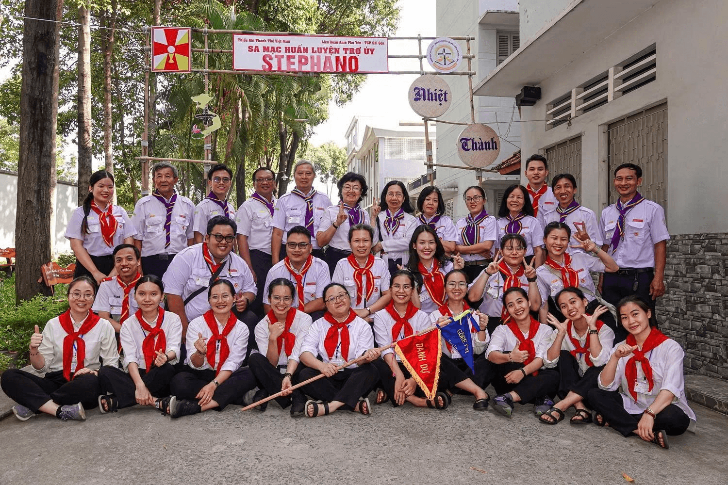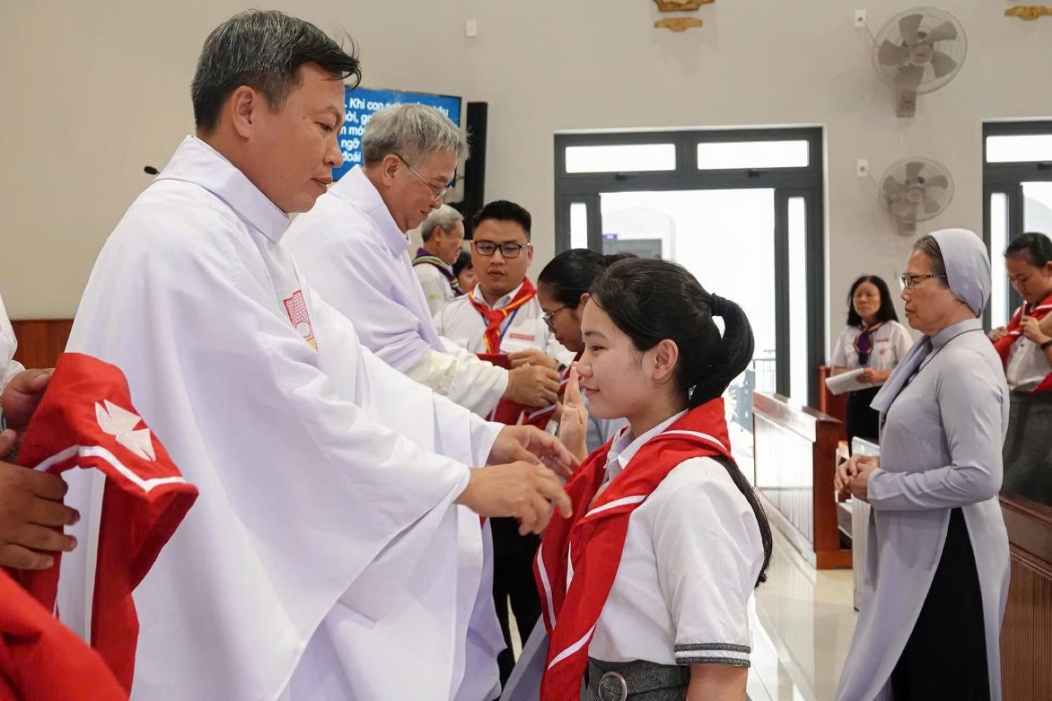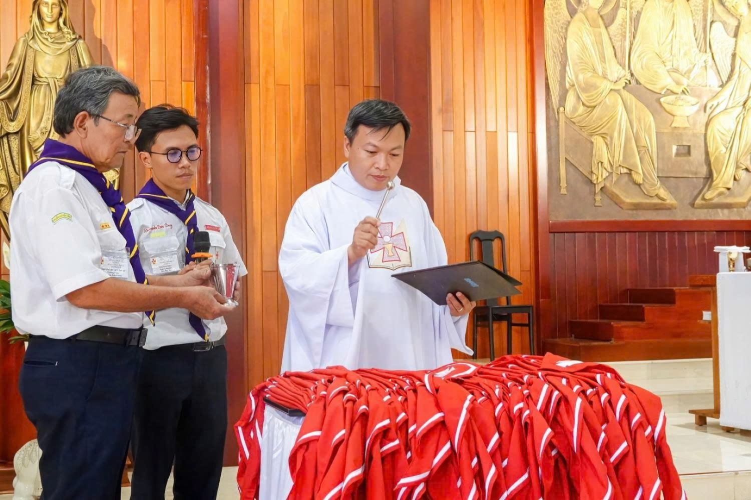 Sau khi làm phép khăn quàng, cha Tổng Tuyên úy và cha Giuse Ngô Vũ Anh Tuấn – Sa mạc trưởng, kiêm Tuyên úy sa mạc – trao khăn quàng cho các Trợ úy, để từ đây các Trợ úy chính thức cộng tác với các linh mục Tuyên úy trong các sinh hoạt TNTT.