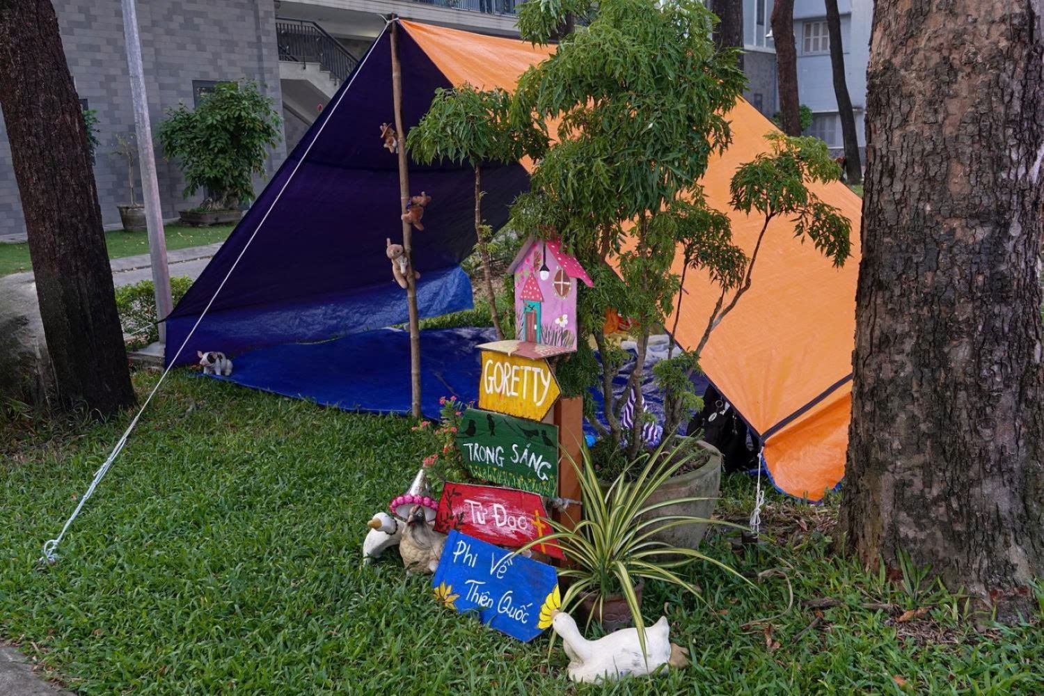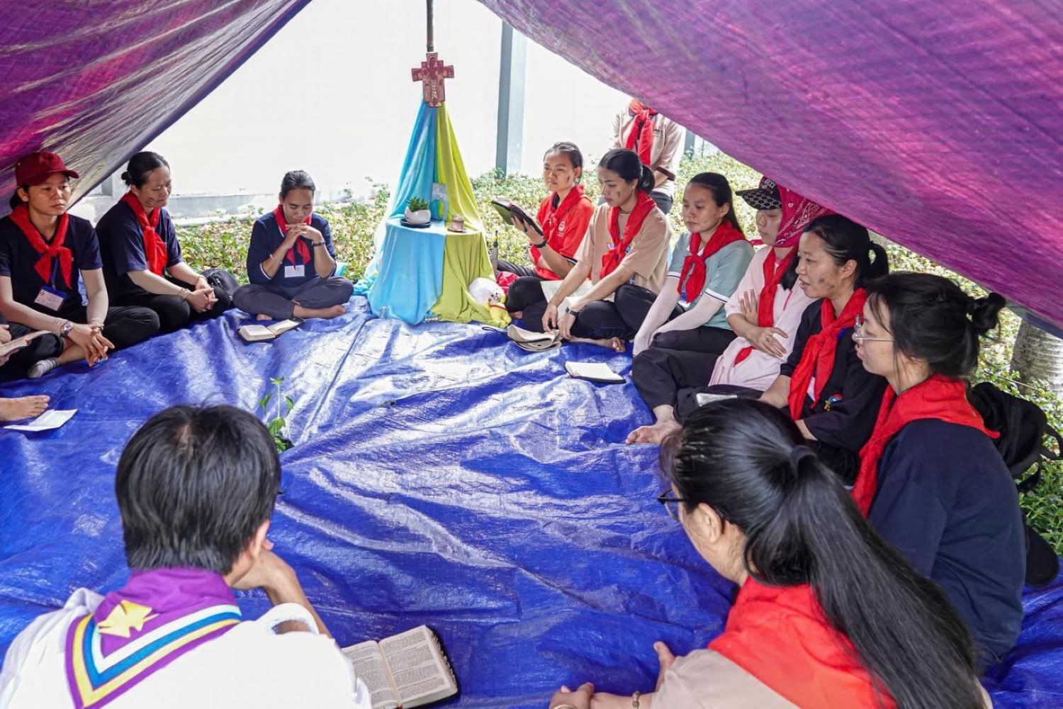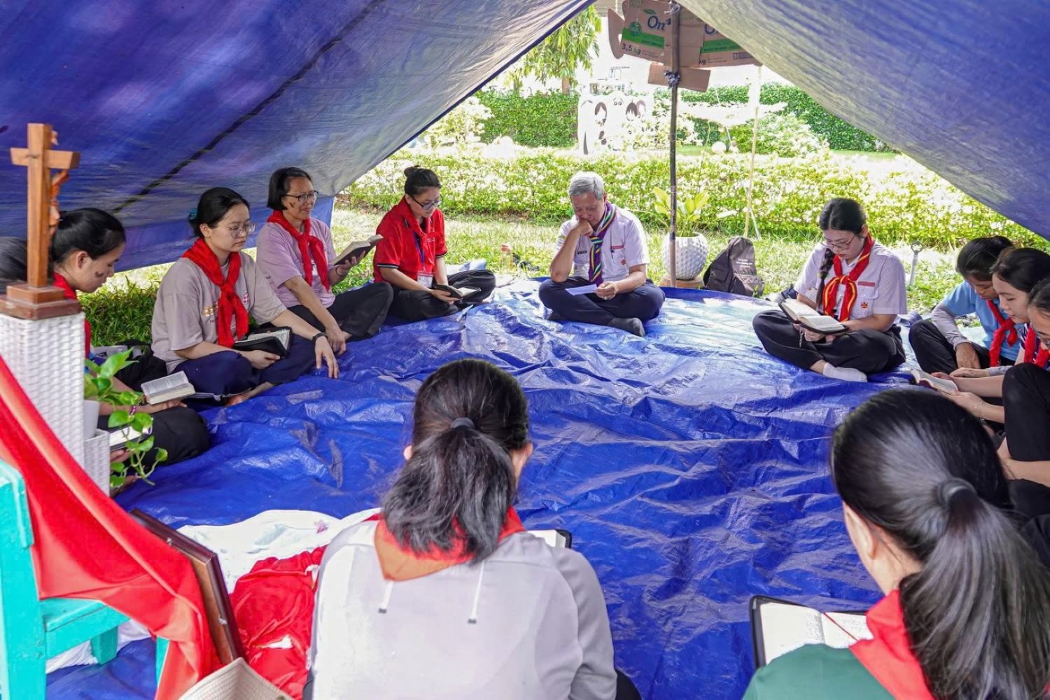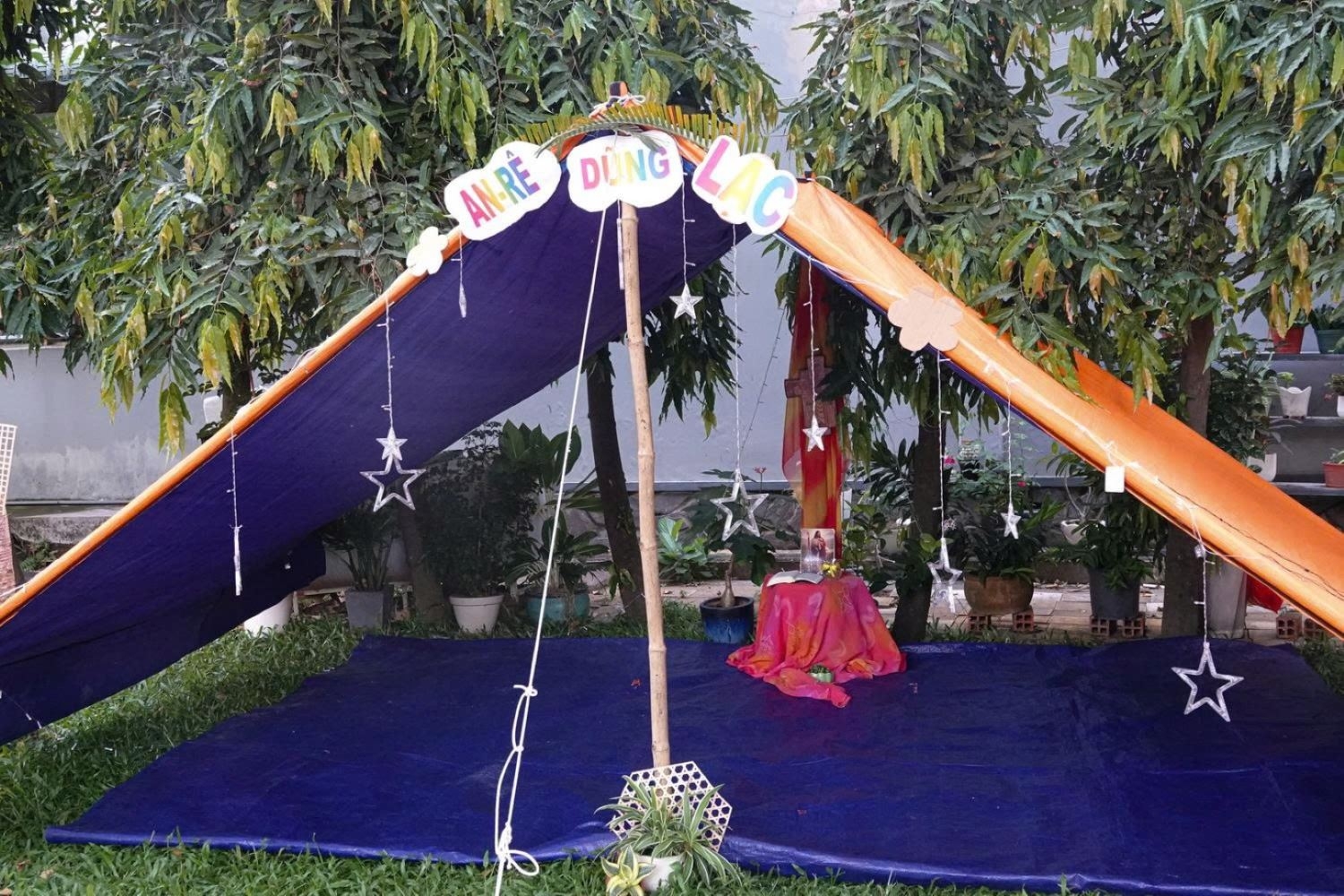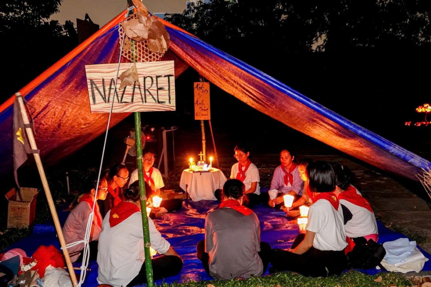 Tiếp theo là bài khóa “Dựng lều” – mái nhà chung của đội trong ba ngày sa mạc – không chỉ vững chắc mà còn được các SMS thiết kế bàn thờ trang trọng và trang trí lều phù hợp với tên thánh của đội.