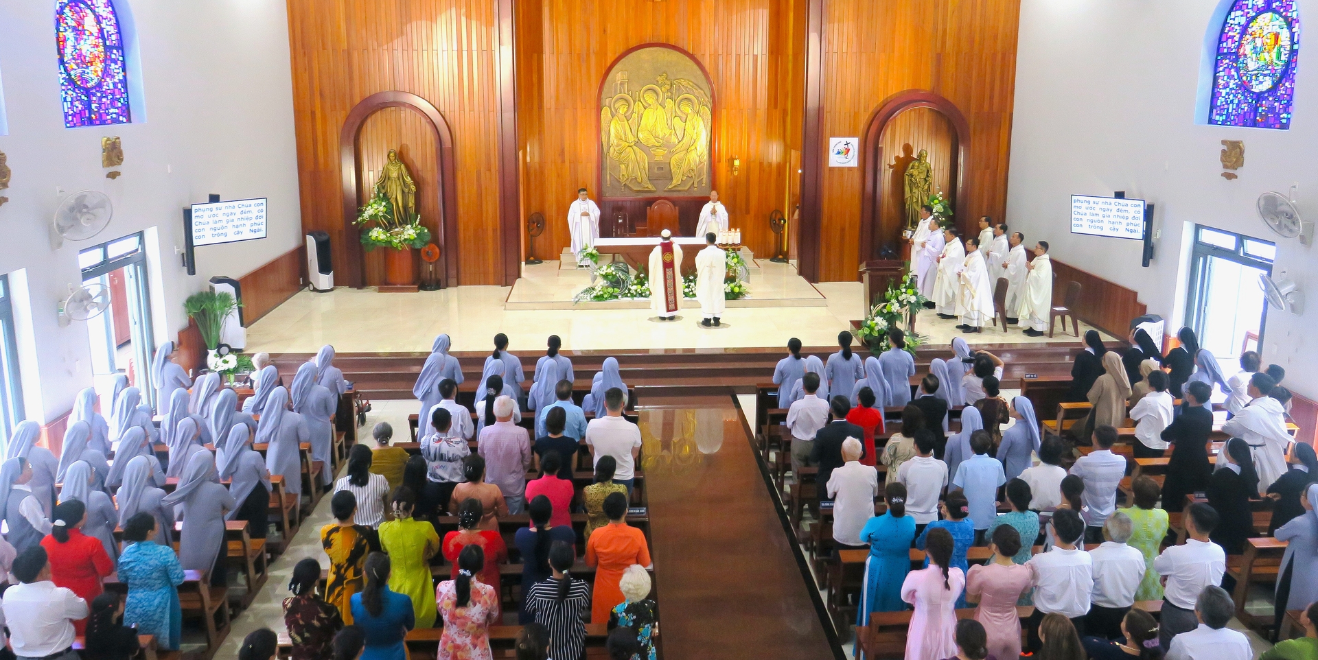 Thánh lễ tạ ơn sáng 15/08/2025 do Đức nguyên Viện phụ Đan viện Thánh Mẫu Châu Sơn Đaminh Savio Trần Thiết Hùng O.Cist chủ tế. Đoàn đồng tế gồm các cha giáo, cha xứ và các cha thân nhân gia đình khấn sinh. Đông đảo thân nhân, ân nhân bạn bè, học trò của các sơ mừng lễ đến tham dự thánh lễ cùng với Cộng đoàn.