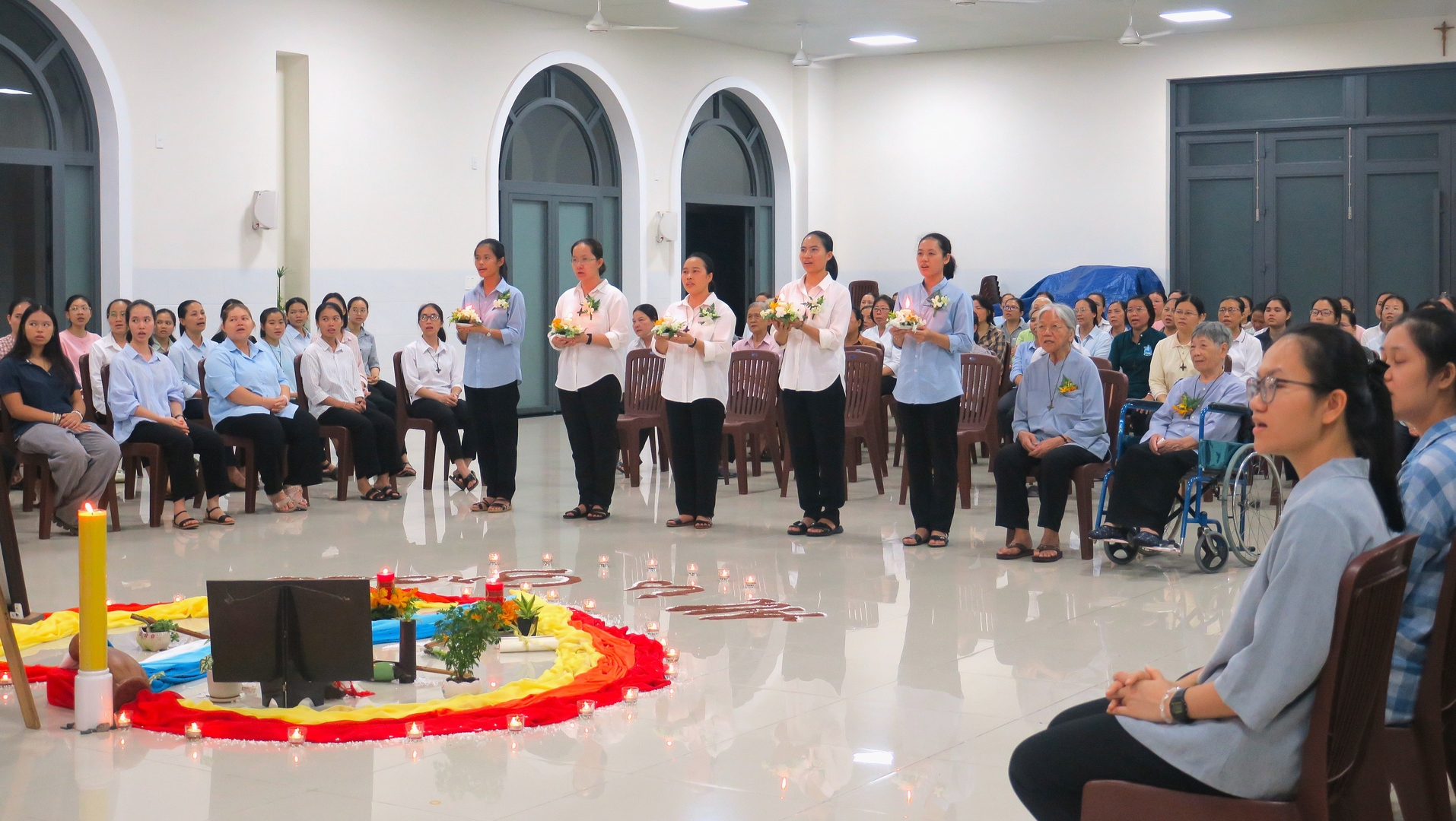 Các chị em Dòng Đức Bà Truyền Giáo đã quy tụ về từ chiều hôm trước, để tham dự giờ kinh mừng lễ các sơ. Ban Phụng vụ hướng dẫn chị em cùng suy niệm về cuộc đời tu trì, như chiếc “ống sáo” của Chúa “cất lên những điệu ca du dương” không phải bởi khả năng của mình, nhưng bởi hơi thở của người thổi sáo. Việc của ống sáo là để mình được khoét rỗng. Điều này giúp chị em sống khiêm tốn và khao khát vét rỗng mình cho Chúa sử dụng cách hữu hiệu hơn. Chị em cũng được xem lại những thước phim về cuộc đời của hai sơ mừng Ngọc Khánh khấn dòng. Từ thuở thiếu nữ xinh tươi, đi qua cuộc đời truyền giáo đầy chông gai, đến tuổi già xế bóng hiện nay, vẫn sáng lên niềm khao khát truyền giáo, chuyển từ hăng say truyền giáo nơi các vùng xa, đến đời sống âm thầm cầu nguyện cho việc truyền giáo. Các em chuẩn bị tuyên khấn được thấy một hành trình tương lai cho lời tuyên khấn của các em sắp tới.