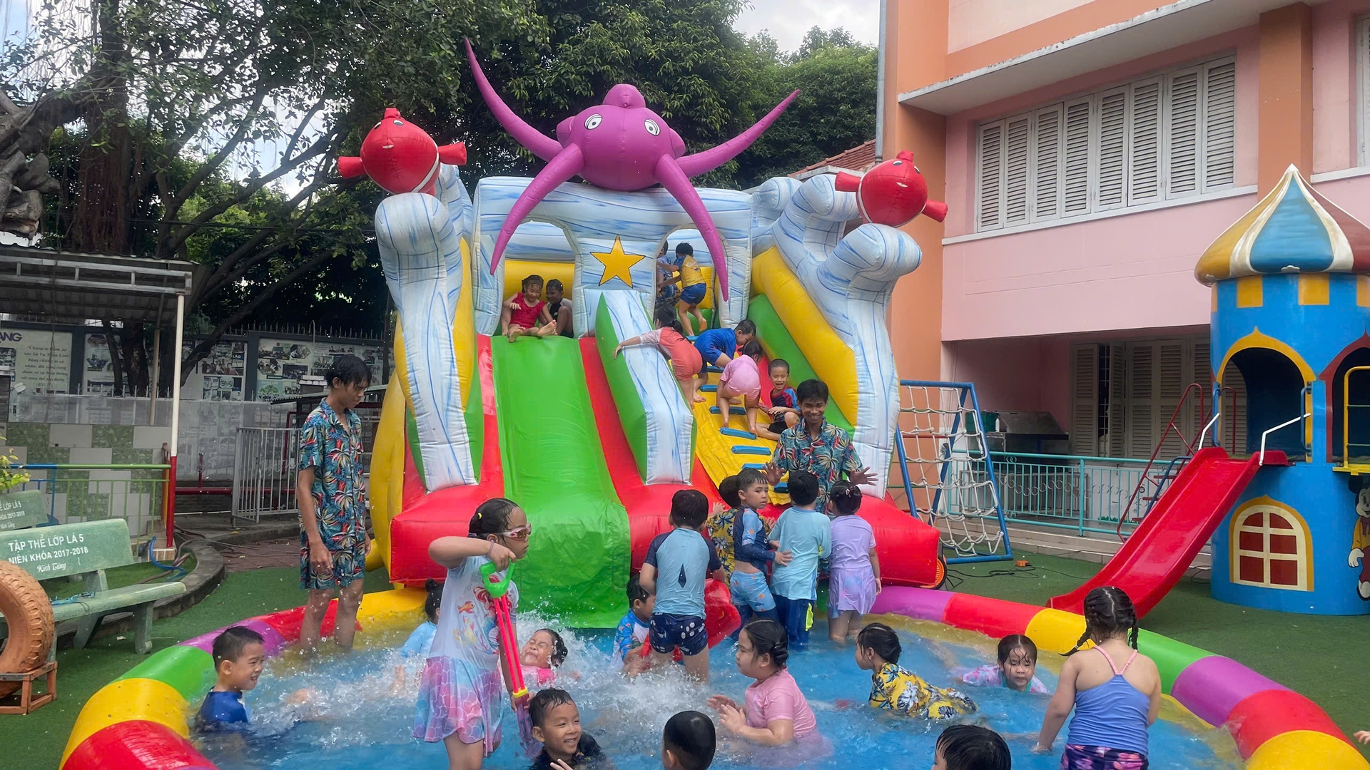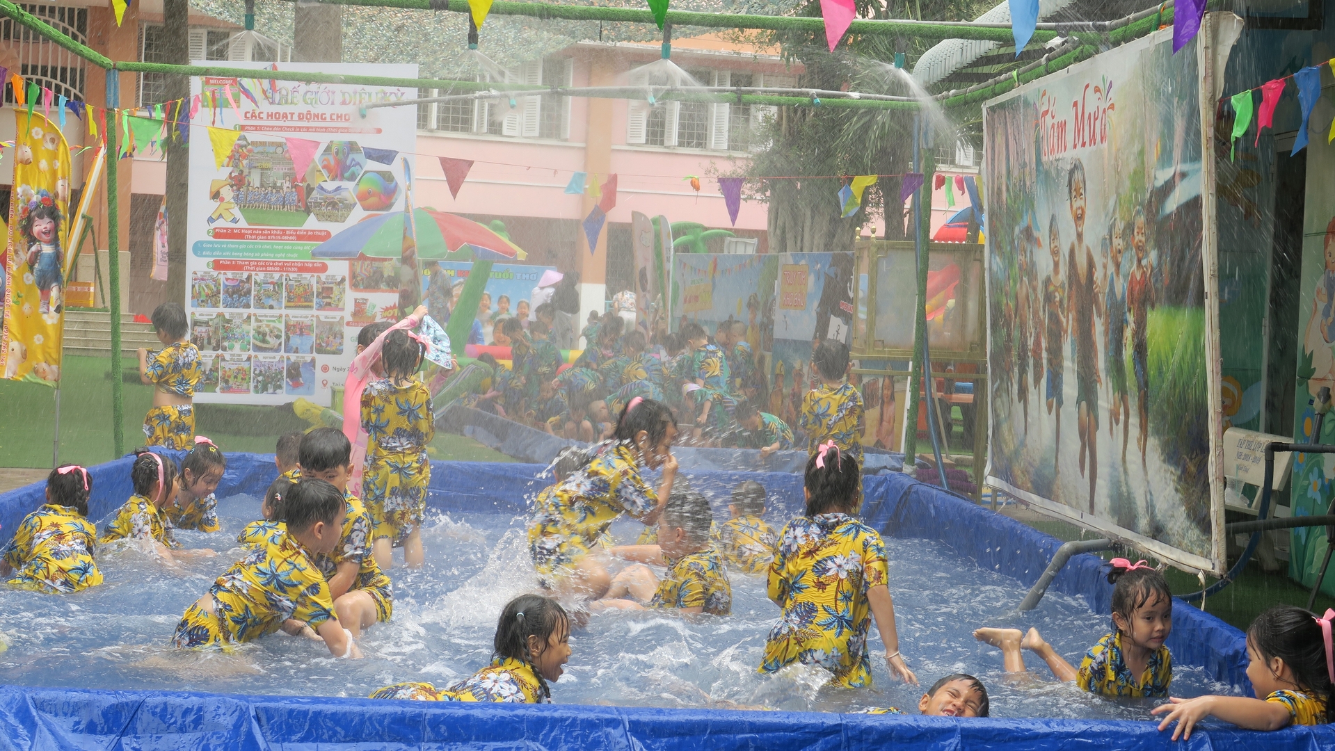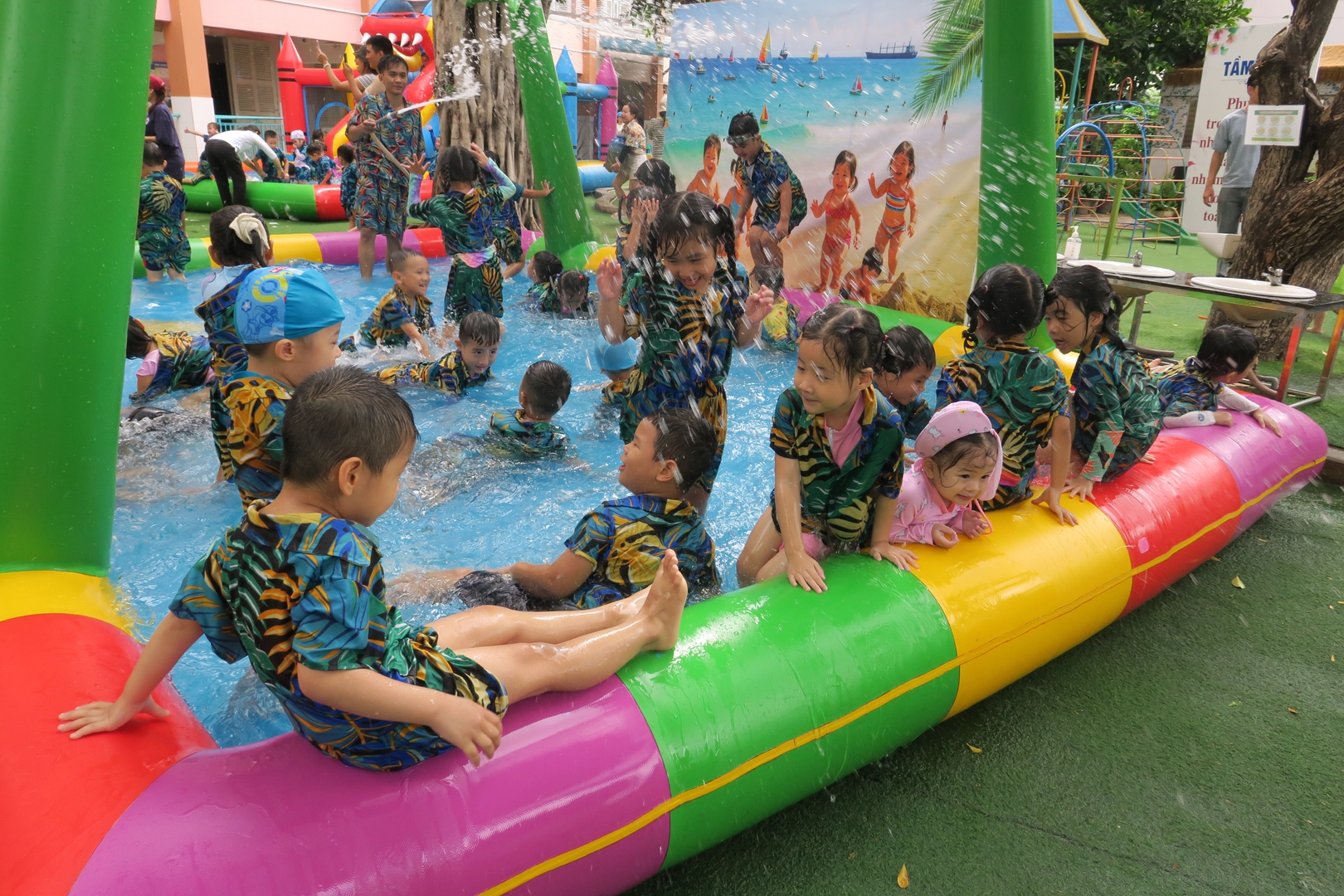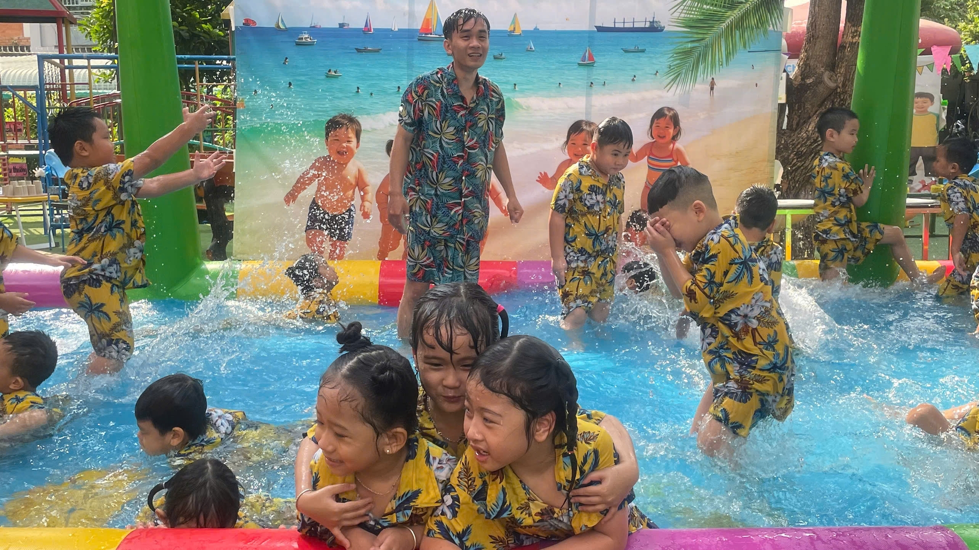 Tiết trời hôm ấy cũng như chiều lòng người, bỗng dịu mát lạ kỳ. Trong khi các em út nhà trẻ đã thấm mệt và đi vào giấc ngủ, thì các anh chị khối Chồi, khối Lá – những bạn nhỏ sắp sửa ra trường – vẫn cứ lưu luyến chẳng rời. Các con chơi say mê như muốn gom hết niềm vui của mùa hè cuối cùng dưới mái trường Thanh Tâm vào ký ức. Nhìn các cô cùng hòa mình, cùng "đằm mình" trong làn nước mát với trò nhỏ, ta mới hiểu vì sao các cô giáo mầm non luôn giữ được nét trẻ trung – bởi các cô đang sống bằng nhịp đập tâm hồn của trẻ thơ.