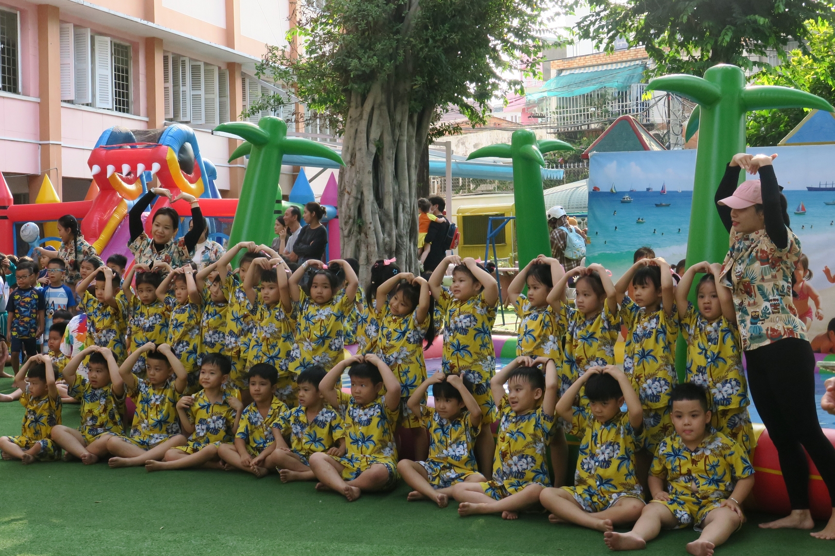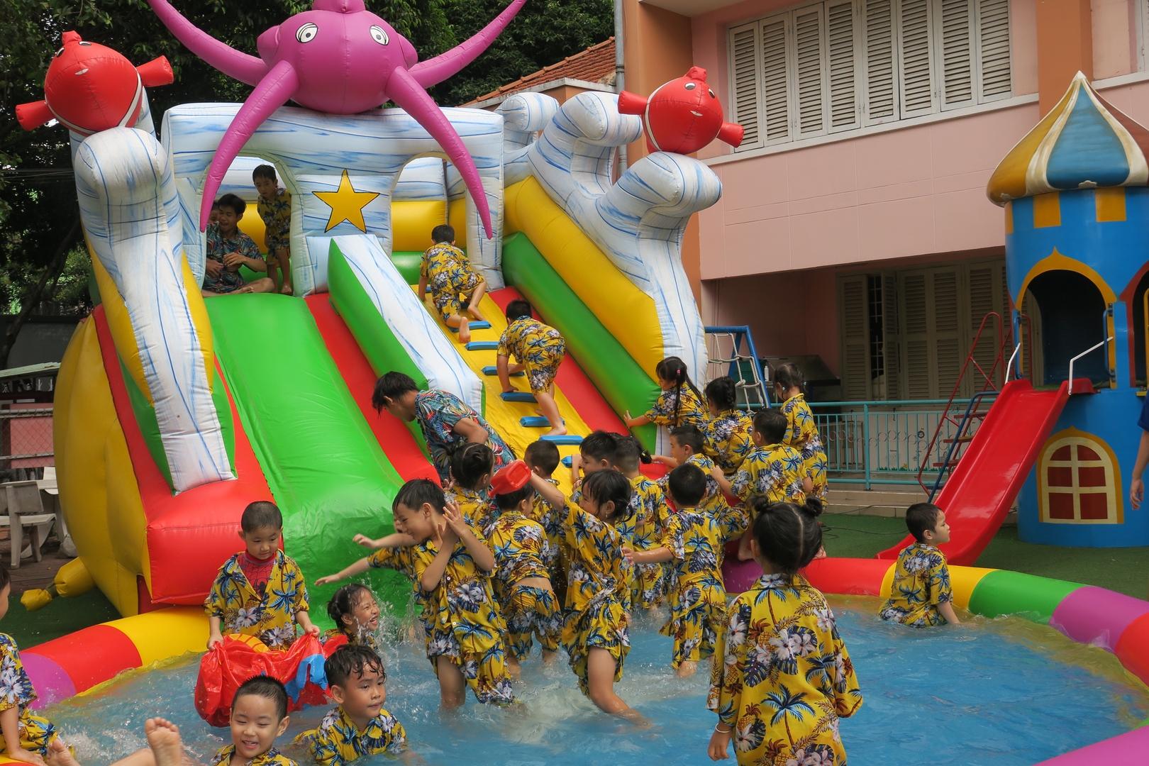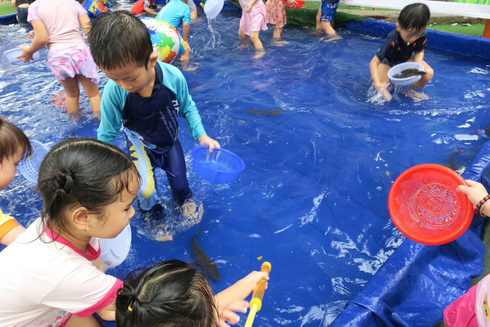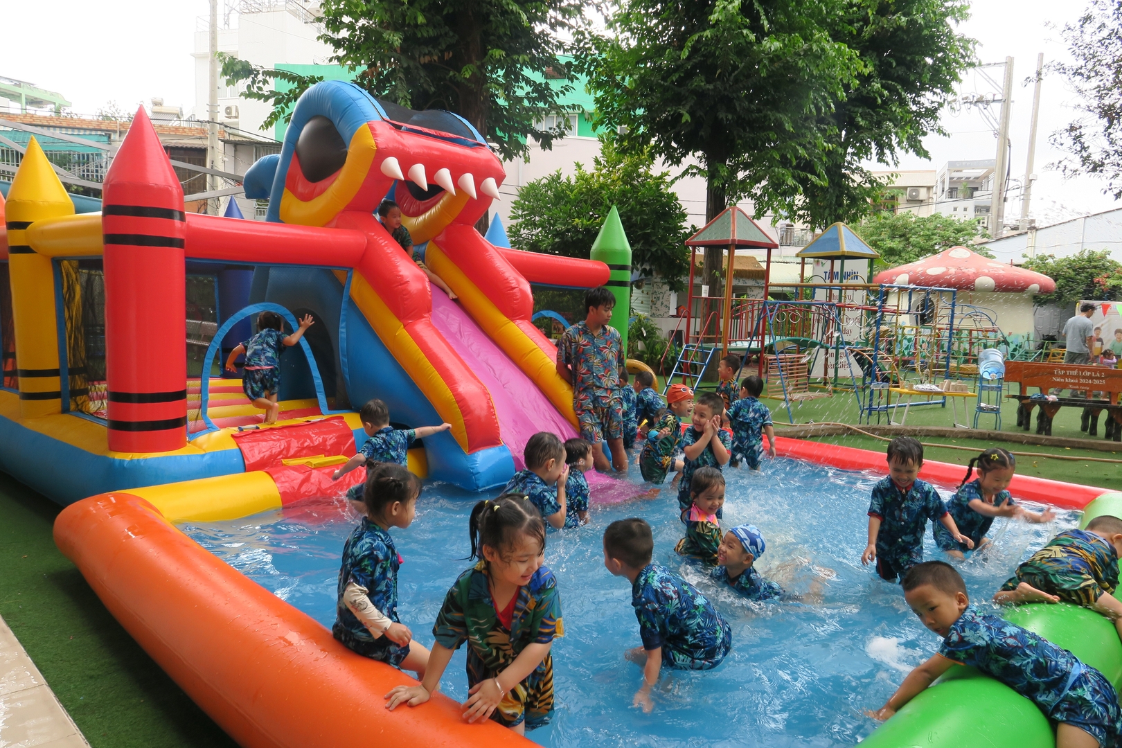 Tiết trời hôm ấy cũng như chiều lòng người, bỗng dịu mát lạ kỳ. Trong khi các em út nhà trẻ đã thấm mệt và đi vào giấc ngủ, thì các anh chị khối Chồi, khối Lá – những bạn nhỏ sắp sửa ra trường – vẫn cứ lưu luyến chẳng rời. Các con chơi say mê như muốn gom hết niềm vui của mùa hè cuối cùng dưới mái trường Thanh Tâm vào ký ức. Nhìn các cô cùng hòa mình, cùng "đằm mình" trong làn nước mát với trò nhỏ, ta mới hiểu vì sao các cô giáo mầm non luôn giữ được nét trẻ trung – bởi các cô đang sống bằng nhịp đập tâm hồn của trẻ thơ.