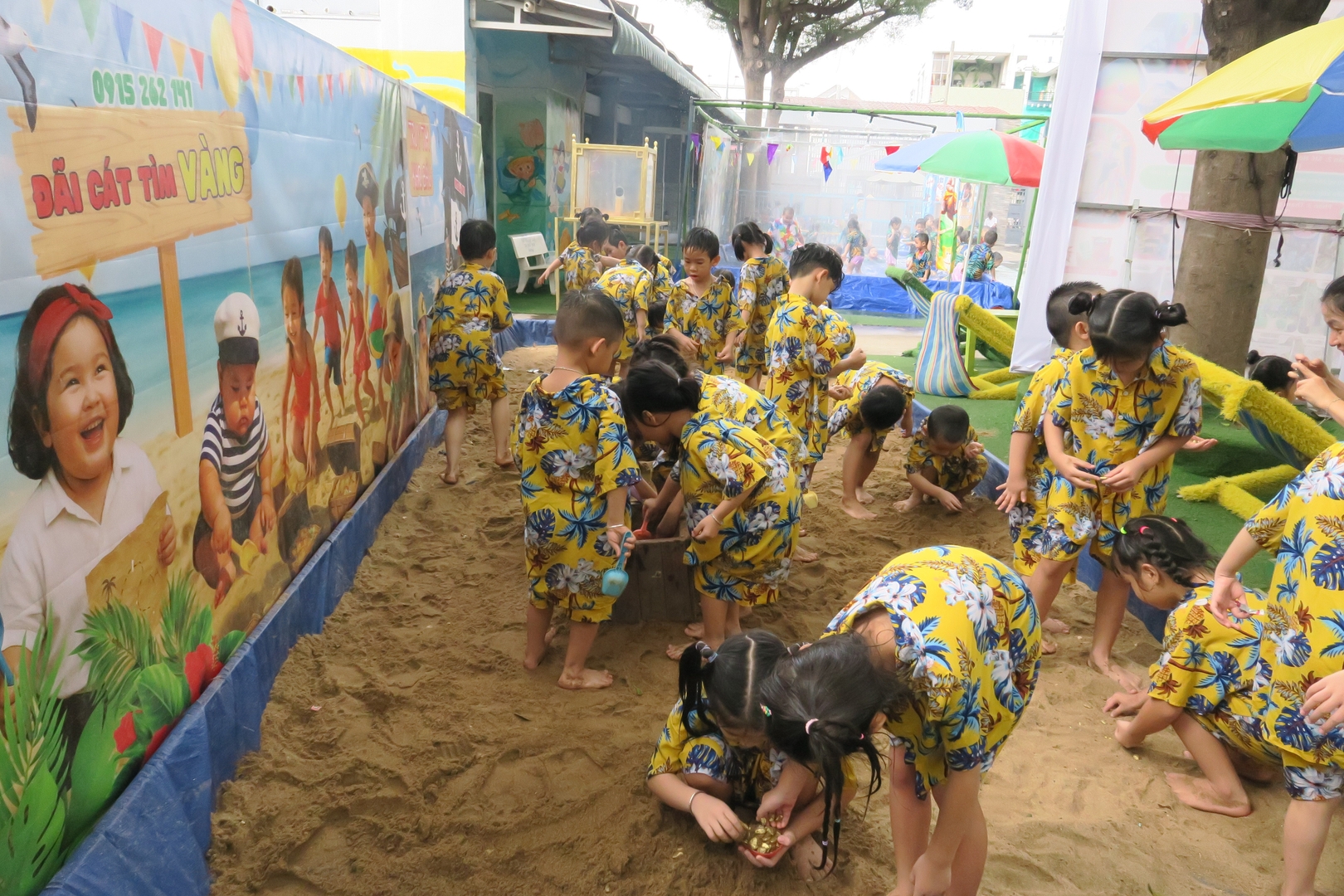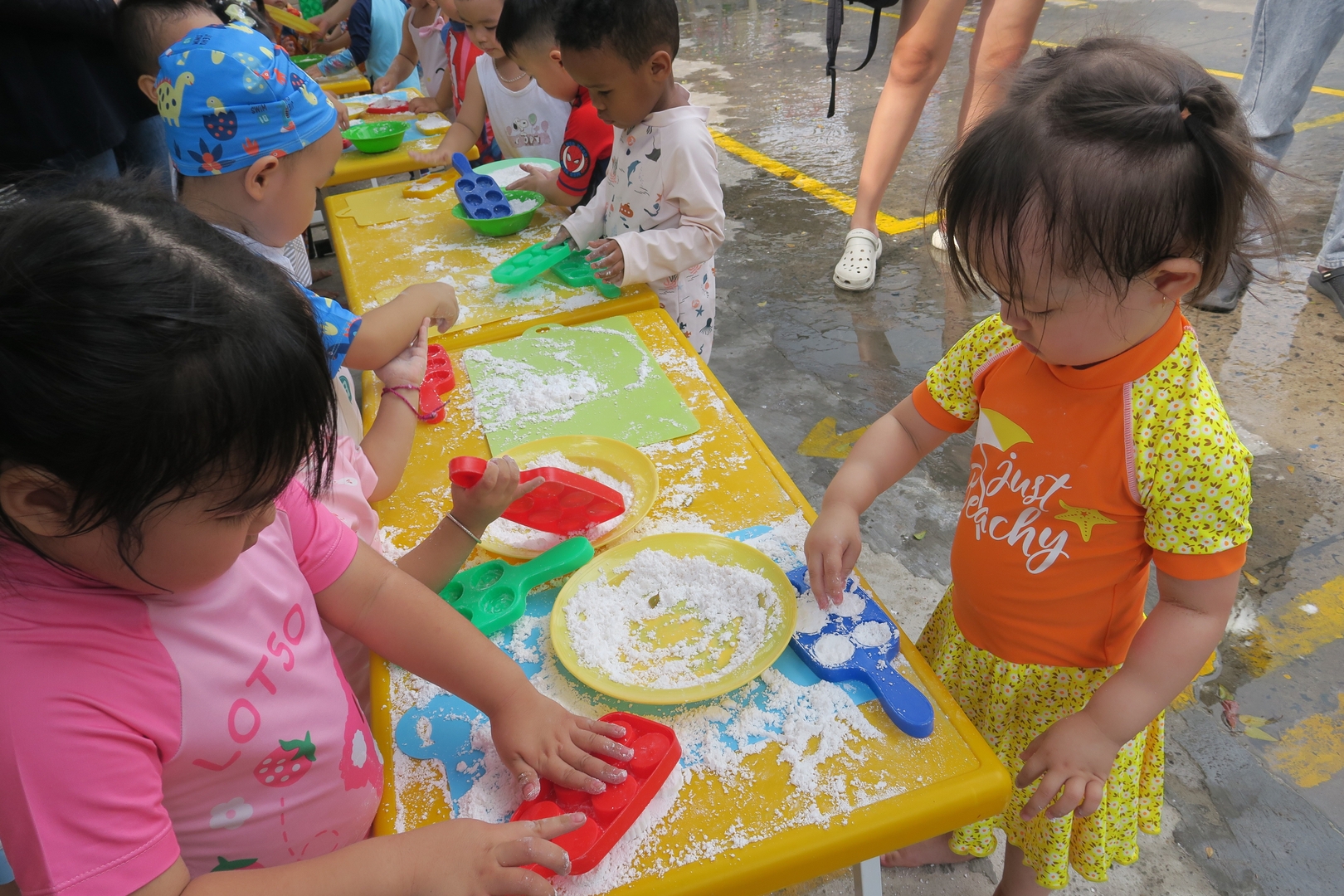 Nếu những trò chơi thú nhún, bắt cá đầy sôi động khiến sân trường rộn rã tiếng cười, thì góc làm bánh phục linh hay đãi cát tìm vàng lại là những khoảng lặng dịu dàng, nơi các con tỉ mẩn học cách kiên nhẫn và khéo léo.