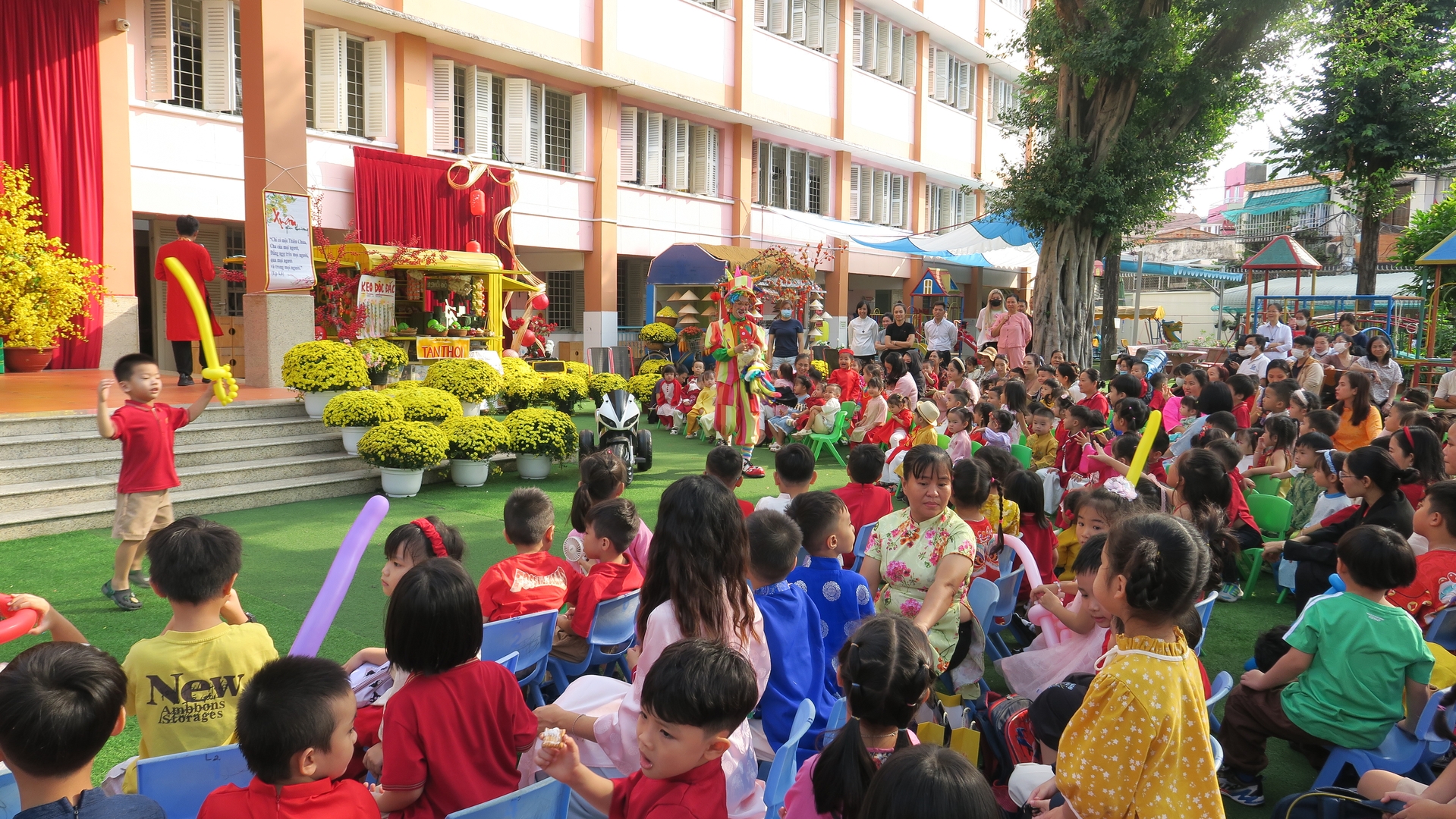 Kế đến, Sơ Hiệu trưởng Nguyễn Thị Thuyết đại diện nhà trường gửi lời chúc tết đến quý phụ huynh và cảm ơn sự tin tưởng, đồng hành gắn bó với nhà trường trong việc chăm sóc, giáo dục và hỗ trợ nhà trường tạo sân chơi cho các con. Đặc biệt trong dịp tết cổ truyền này phụ huynh đã tặng nhiều hoa tươi khiến sân trường thắm đượm sắc xuân.