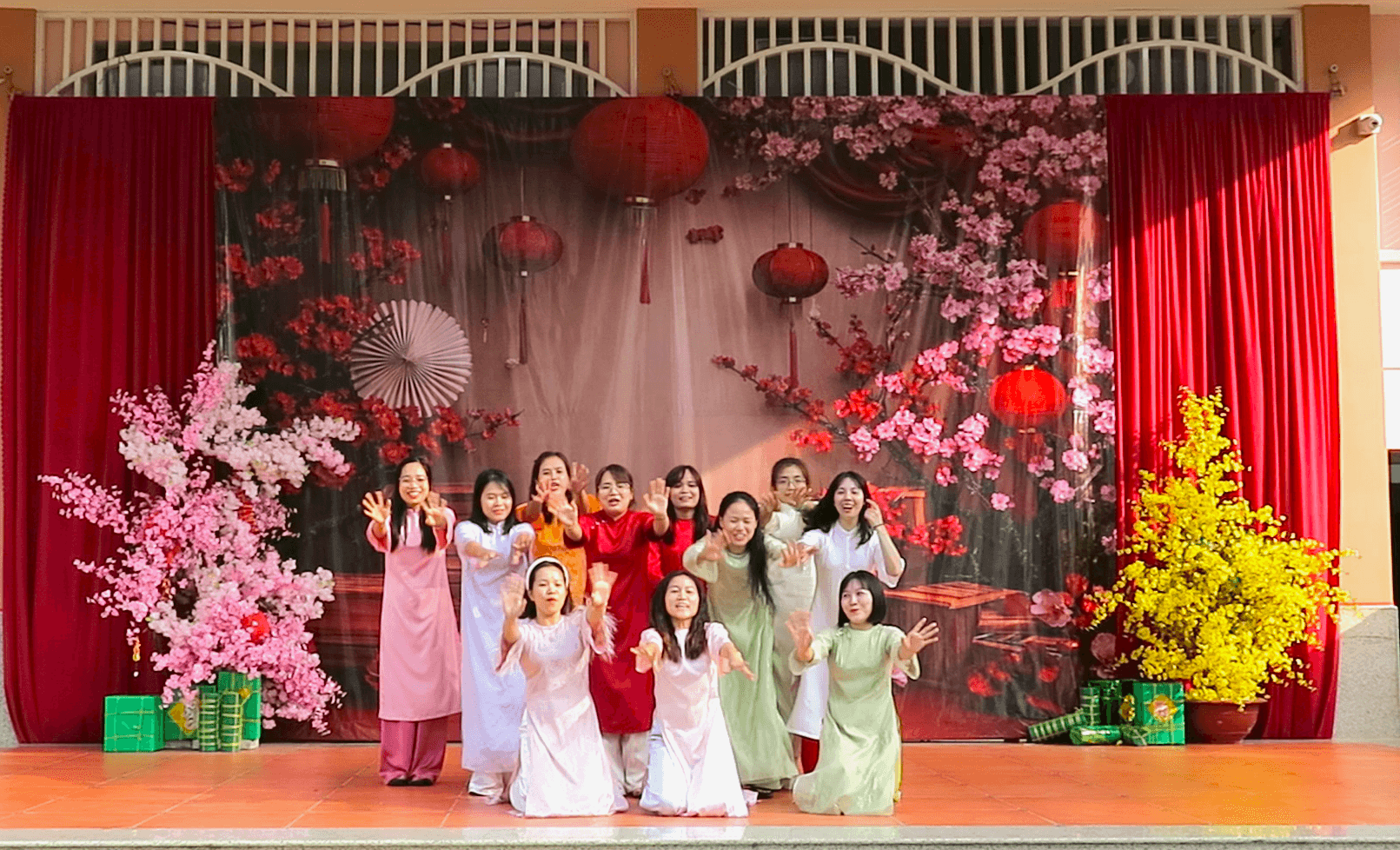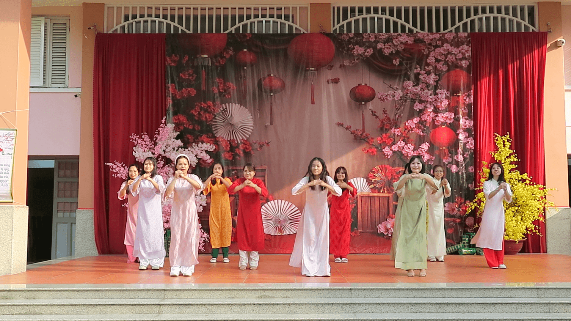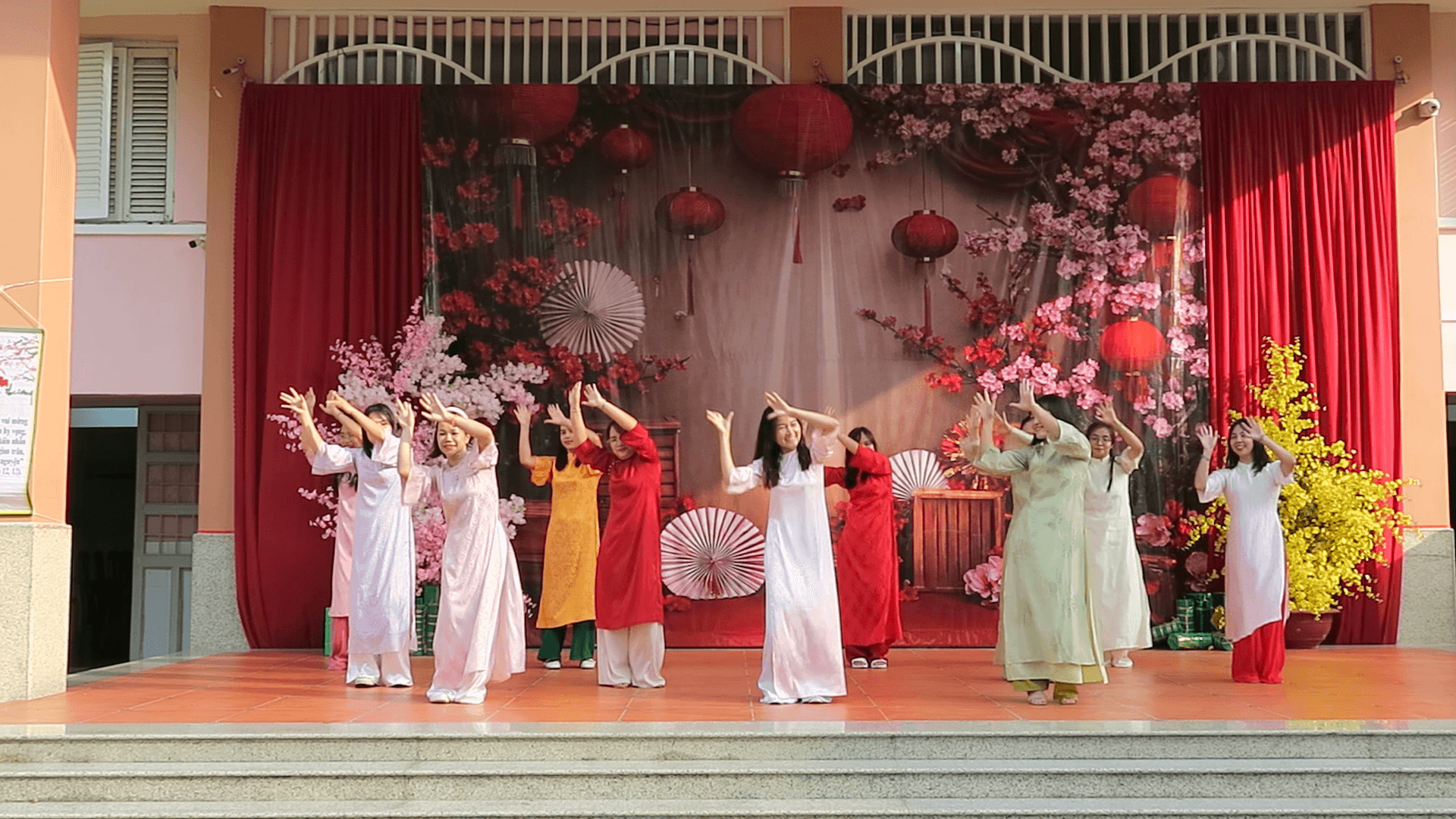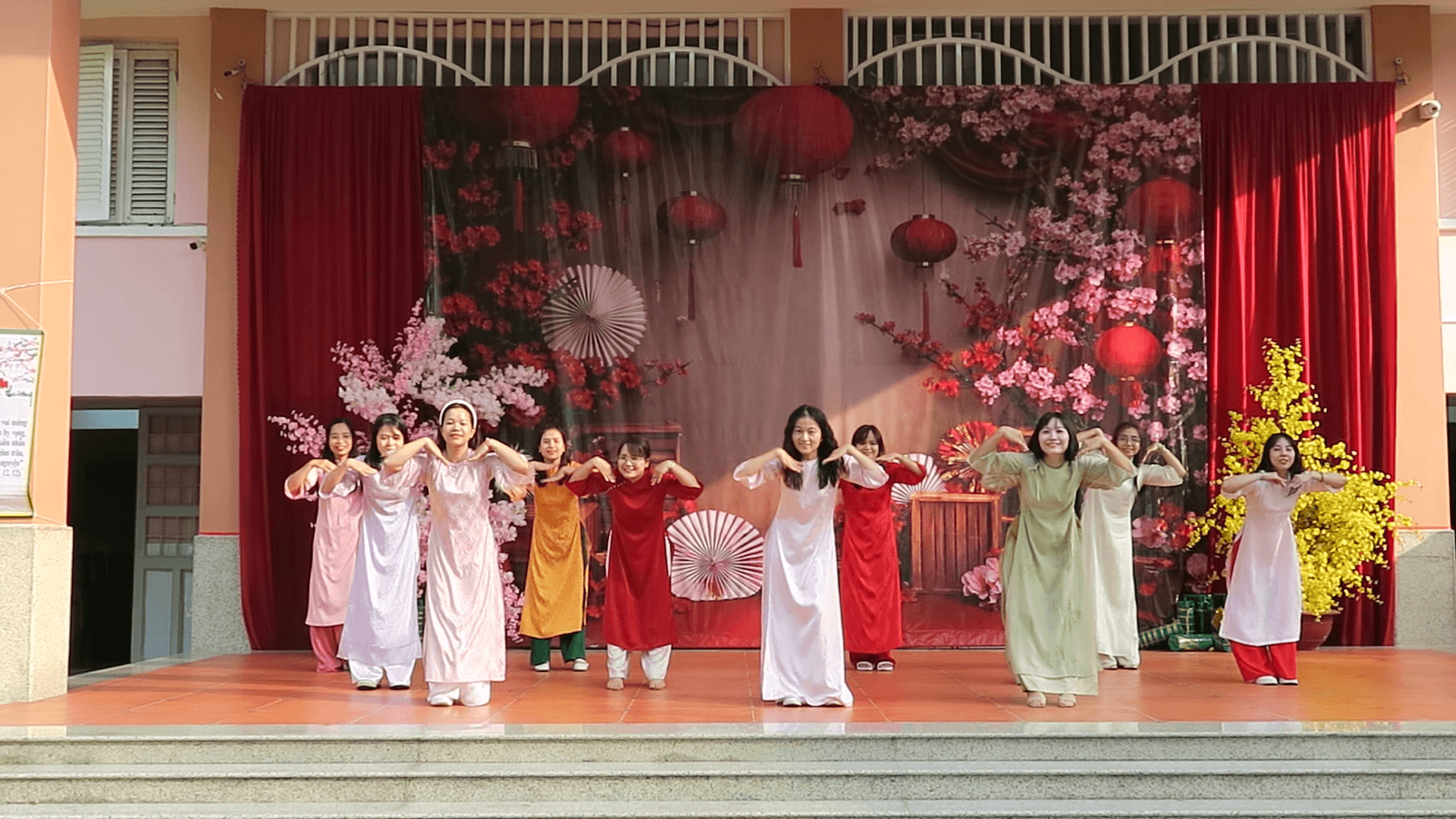 Đặc biệt, phần Múa cộng đồng trên nền nhạc “Tết là đây chứ đâu” do các cô giáo xinh tươi dẫn dắt đã tạo nên một vòng tròn kết nối tuyệt vời, khi toàn thể giáo viên và học sinh cùng hòa chung một nhịp điệu, lan tỏa niềm vui sum vầy.